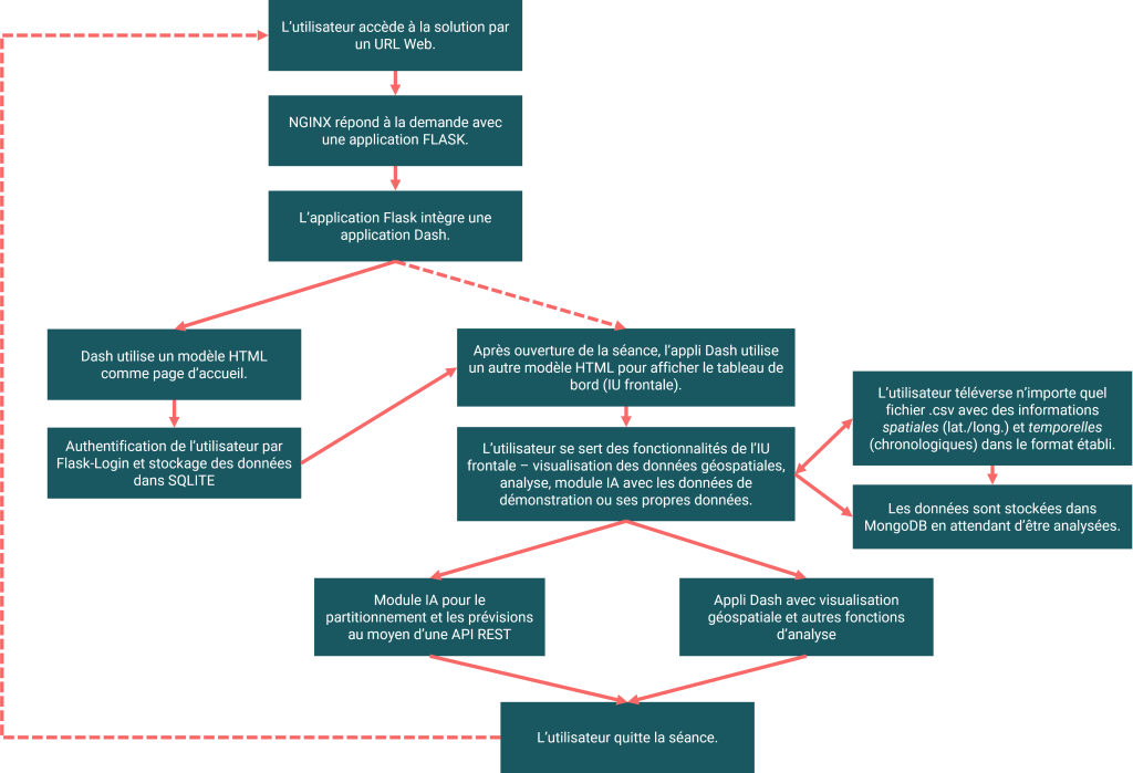 Un module frontal bâti avec Dash de Plotly (en Python). Il est à la base de l’analyse des données et de leur visualisation géospatiale. Dash présente plusieurs avantages : ses applications s’exécutent dans un navigateur Web; on peut aussi les déployer sur des machines virtuelles ou des grappes Kubernetes puis les partager avec un URL. Puisque ses applications sont visionnées dans le navigateur Web, Dash est par définition adapté à une variété de diverses plateformes et aux applications mobiles.