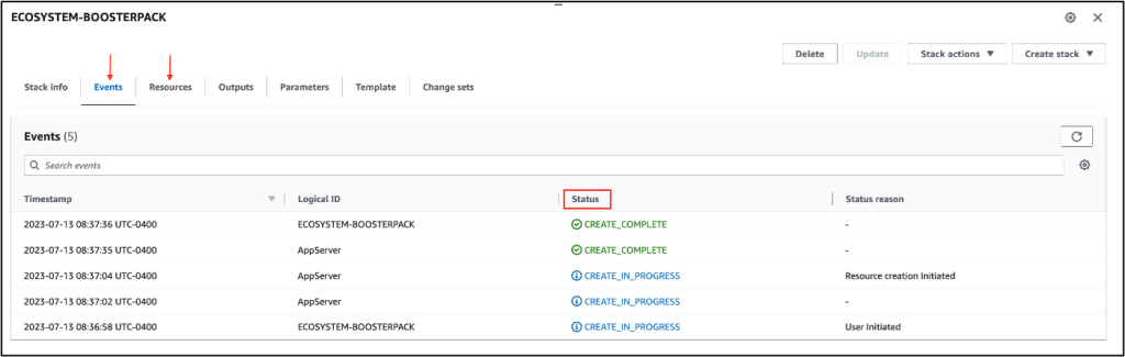 Le déploiement commence par la création d’une nouvelle instance. Le reste est automatique. Suivre le développement de l’instance AWS n’est possible qu’avec les onglets Événements et Ressources de la console CloudFormation. Pour vérifier l’avancement du déploiement, vous devrez donc vous connecter au serveur de l’application.