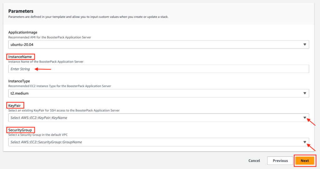 Cela fait, cliquez Suivant pour passer à la deuxième étape de Cloudformation et remplissez le formulaire de configuration. Dans le champ InstanceName, donnez un nom unique à l’instance de votre serveur d’application, puis complétez le formulaire avec les menus déroulants. Veuillez noter que certains paramètres comme ApplicationImage et InstanceType sont déjà configurés et ne peuvent être modifiés.