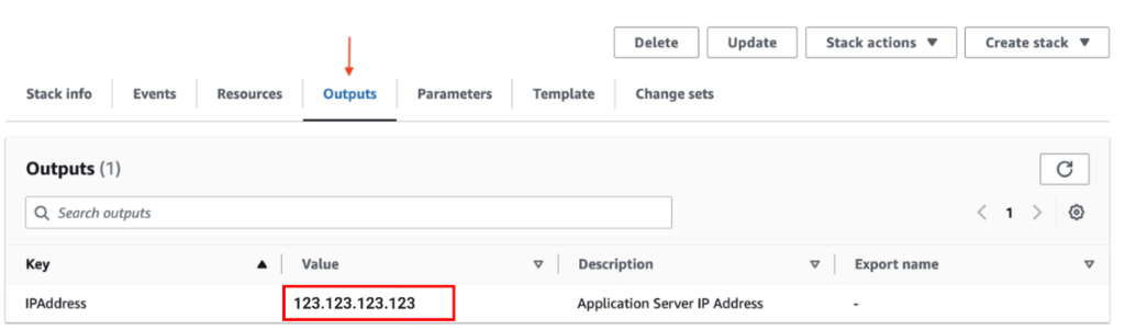 Remarque : notez l’adresse IP qui apparaît sur l’onglet Sorties de la page CloudFormation du Propulseur. Il s’agit de l’adresse IP externe de l’instance qui vient d’être créée. Vous en aurez besoin pour accéder à l’interface web de l’application ou vous connecter au serveur par le protocole SSH.