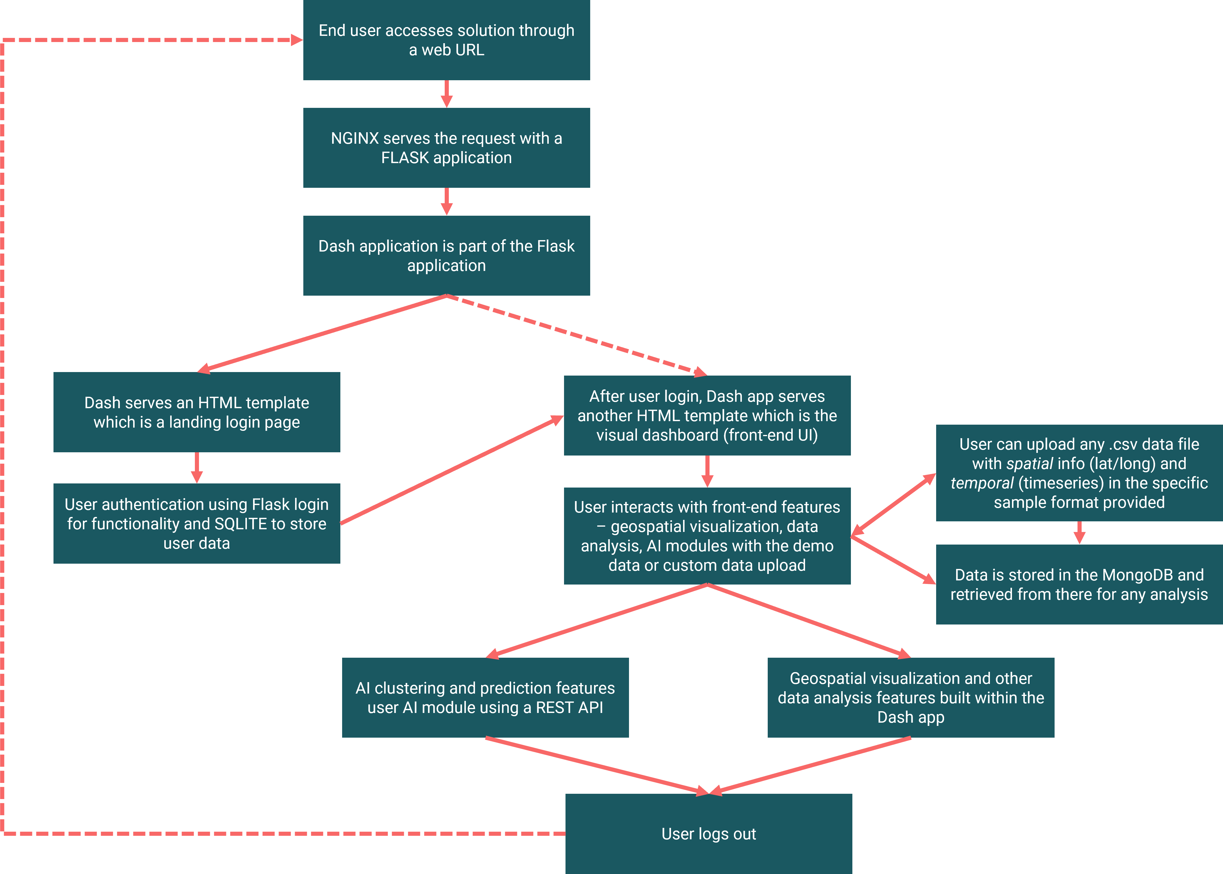 Front-end module built with Dash plotly (in Python), which forms the core of the data analysis and geospatial visualization. Dash has several advantages including but not limited to Dash apps are rendered in the web browser, they can be deployed to VMs or Kubernetes clusters and then share them through URLs. Since Dash apps are viewed in the web browser, Dash is inherently cross-platform and mobile ready.