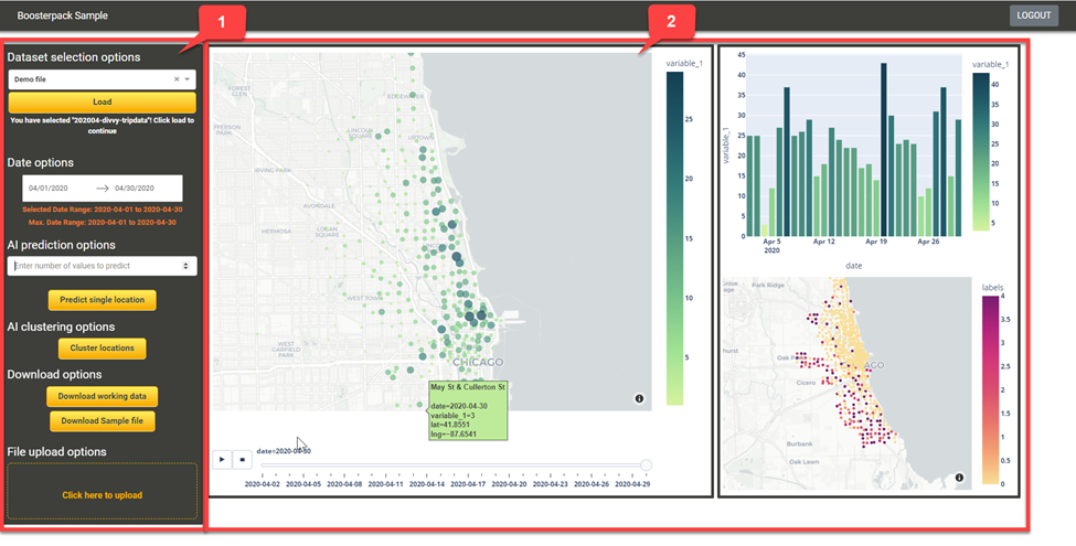The screenshot above shows the user interface with a functional control panel on the left side and the visualization on the right. In the visualization, the label variable_1 represents the entity we want to predict and visualize which is part of the required upload file format but variable_1 can signify anything depending on the input. For real-estate data, variable_1 could represent house prices or for crime data, variable_1 could represent number of thefts.